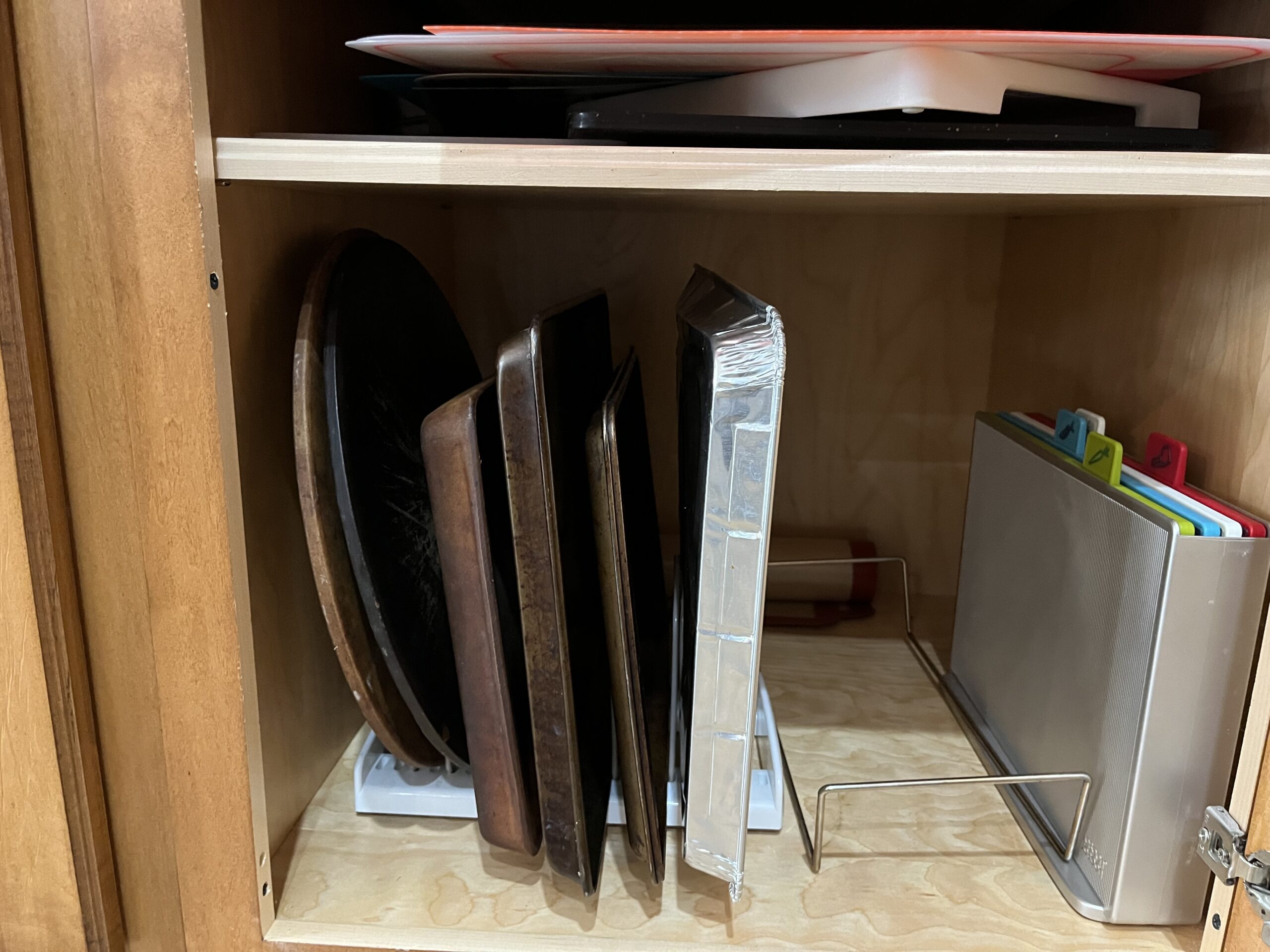 I used to stack my pans, but then you have to take everything out to find the one you want. Sometimes you can't even see what's there. This rack keeps everything stored vertically so I can slide the pans in and out easily. It's also adjustable so I can store different thicknesses of pans.